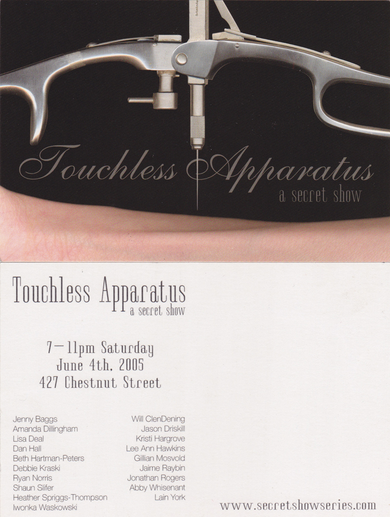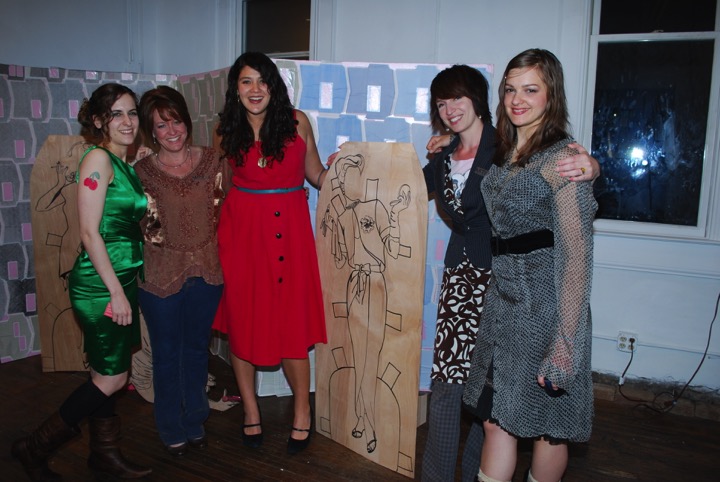 Bottom left: Secret Show founders Jason Driskill and Amanda Dillingham. Featured work by Erin Hewgley (bed made of hair and saddle made of female anatomy), Barbara Yontz and Casey Yorkunas (sculpture mounted from ceiling with sound piece), Jacqueline Meeks (video of hickeys on back), Ryan Lewis (cups of kool aid referencing Jonestown Massacre)
