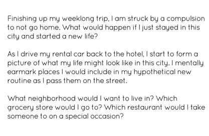 This zine is about the nature of loneliness and a longing for connection. It is the story of two dates, an internet flirtation, and letting go of a long term relationship.