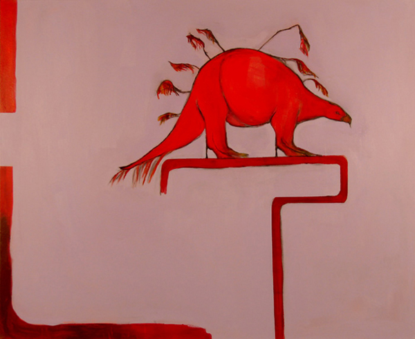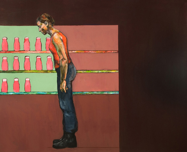 I went to an anonymous florescent store to buy a bottle of pink milk, which had been drawn from the stegosaurus in its sleep. I ducked quickly past the cashier, hating to have to talk and interrupt my private purpose. The milk was in a pristine retail arrangement of order and simplicity. I plucked a chilled pink bottle from the display, touching the condensation on the glass.