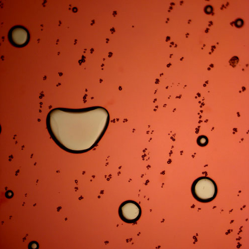 I am attracted to images of fruit juice for their color and vibrancy. Cranberry juice viewed at 40x is bubbly and amorphous like a lava lamp. The pictures are viscous and textured landscapes, atmospheres of strange planets.