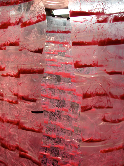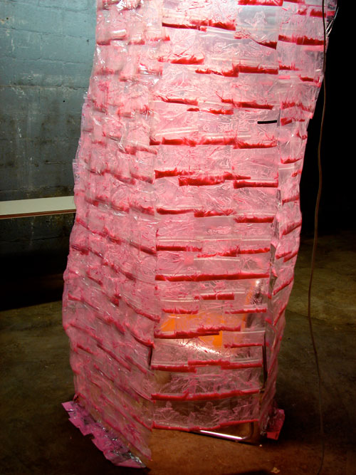 "Protective Coating Action" is an interactive piece where the viewer can sit inside the chamber and be completely enveloped in Pepto Bismol. It is claustrophobically close to you. You can see the world outside the piece, but it feels really far away. Some people enjoyed sitting in the piece, some found it disturbing.