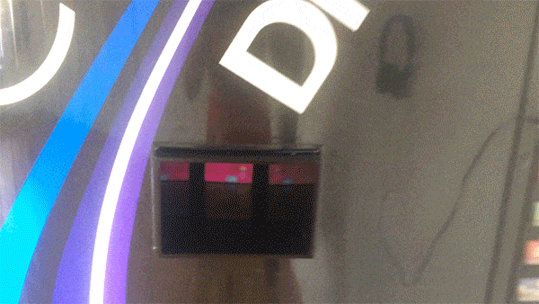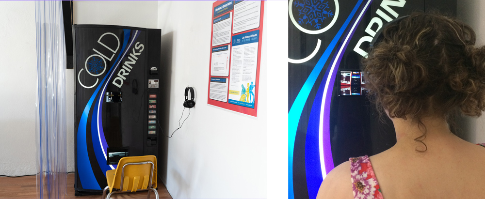 A cut-out portal in the vending machine reveals a video playing on loop. There is a chair for one person to watch the film.