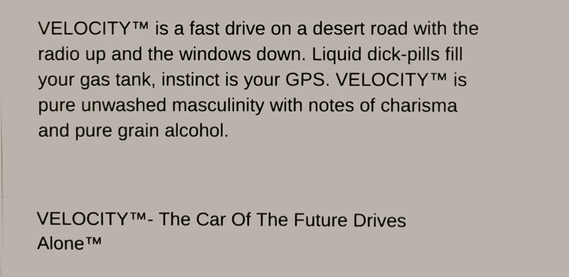 VELOCITY is a simulated perfume store catering to sentient monster trucks.